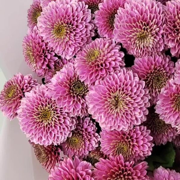 Воздушные хризантемы Сантини в стильной упаковке. Хризантема является рекордсменом по стойкости в вазе, букет из хризантем будет радовать получателя более 14 дней.